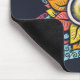 Spooky reptile eye mousepad with a digital art of a weird eyeball with reptile iris and pupil surrounded with colourful petals. This crazy surreal illustration has fun yellow, orange, coral, pink and light blue colours with decorative elements over customisable dark blue background and, being strange and dark, is great for Halloween.