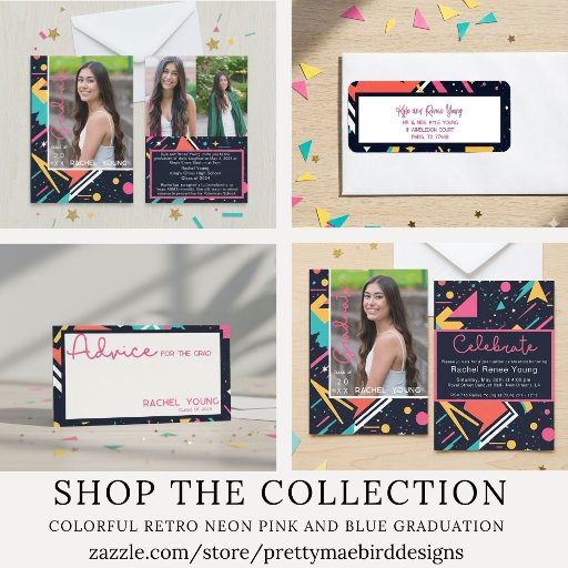 Step into the vibrant world of the '80s with our retro-inspired graduation party napkin! Against a backdrop of deep navy blue, bursts of neon pink, electric blue, and lime green form abstract shapes reminiscent of the era's iconic aesthetics. Front and centre, a cherished photo captures the essence of your achievement, radiating pride and accomplishment. Turn the invitation over to discover two more snapshots, showcasing the journey that led to this momentous occasion. Amidst the lively hues, our invitation message beckons: