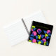 Personalised notebook with a fun retro 1990s inspired neon geometric shape graphic design in bright yellow, blue, and pink.