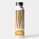A colourful retro vintage vibe sunrise sunburst water bottle personalised with your name in a retro typeface. Groovy 70's style in olive greens, orange and terracotta.