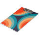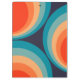 Abstract illustration of colourful retro style circles in beige, pastel orange, orange and turquoise colours on navy blue background.