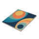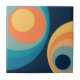 Abstract illustration of colourful retro style circles in yellow, blue, orange and turquoise colours on navy blue background