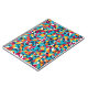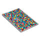A dynamic abstract design of curved and angular shapes in bright hues—blue, orange, red, yellow, and white—creating a playful retro-inspired geometric mosaic.