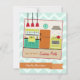 A cooking party invitation featuring an illustration on front of a retro inspired kitchen decorated with a turquoise, yellow, red, and orange colour scheme. Personalise the text on front and back. Background is light blue with zig zags.