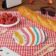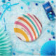 Abstract retro style illustration of colourful (yellow, blue, orange, purple, pink, beige, turquoise) curves decoration. It is easy to customise it by changing the names/date/text etc.