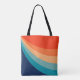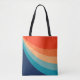 Abstract illustration of colourful (red, orange, blue, turquoise, navy blue) sun rays with curvy geometric stripes decoration