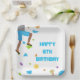 Rock on! The climbing wall with colourful holds is in fun watercolor texture. Text reads "Rock On" with room for the birthday girl or boy's message below. Perfect plates for a rock climbing theme birthday party/
