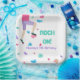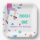 Rock on! The climbing wall with colourful holds is in fun watercolor texture. Text reads "Rock On" with room for the birthday girl or boy's message below. Perfect plates for a rock climbing theme birthday party/