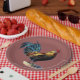 Colourful vintage illustration of a charming farmyard rooster or cockerel. This picture with the right on trend background colour of Marsala would make a great decorative addition to your interior decor in a country kitchen. These paper plates are perfect for a lunch party or for everyday use. The rooster has beautiful blue tail feathers, a golden mane of feathers extending from his head to tail and a bright scarlet red coxcomb. He stands in the farmyard with a thoughtful expression, one foot in front of the other. He is a very attractive bird and has been captured perfectly in this vintage drawing. The trendy Marsala background colour sets this chicken off very nicely but you can of course change the background colour to whatever you wish by using the Customise option. Designed by Lark Designs