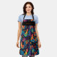 Modern apron with a colourful floral rooster pattern on a black background and a feminine, hand lettered script name. Personalise with your name.