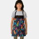 Modern girls apron with a colourful floral rooster pattern on a black background and a feminine, hand lettered script name. Personalise with your name.