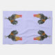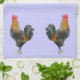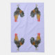 A photograph of a colourful rooster is repeated in each corner of this towel on blue (customisable) background.