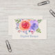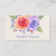 Business cards with a fanciful floral bouquet with watercolor roses. Stylish, whimsical and creative. A bundle of roses in pink, purple and yellow. With lots of sprigs and leaves in green, pink, purple and blue. Background is an off-white champagne colour.