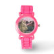The original cute donkey portrait on this unique wrist watch with numbers is an original pencil drawing of a little donkey I photographed at a festival. This sepia realist art donkey picture is set against an original stylised landscape sunset painting. The original landscape image is a watercolor painting of a few winter trees against a pink sunset sky. This is a customisable watch, you can personalise it with your own text.