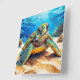Vivid artistic depiction of a sea turtle with bright colours swimming among corals in a clear underwater ocean scene.