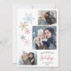 This modern 3 photo Christmas card offers coloured snowflakes in blue, gold, pink and grey. The greeting "Happiest Holidays" appears in a combination of curved and handwritten style text. Personalise with your family family photos, name and year.
