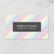 Elegant business cards for any kind of business like interior designer, colour consultant, image consultant, textile, upholsterer, furniture refinisher or other business featuring a striped rainbow unicorn pattern in pink, lilac, violet, green gold and yellow and your name and title on the front in refined typography in trendy white colour over a dark grey label.