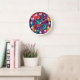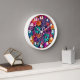 A clock with a cool digital 3d style pattern. Bright and colourful flowers with a cool style which looks like paper cutouts.