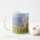 Cheerful coloured flowers with red and pink tulips, yellow flowering wild daffodil against white tree blossoms on a sunny bright day in spring with blue sky. A beautifull landscape photo taken by Katho Menden. This mug is an enchanting gift idea for nature lovers.