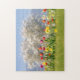 Cheerful coloured flowers with red and pink tulips, yellow flowering wild daffodil against white tree blossoms on a sunny bright day in spring with blue sky. A beautifull landscape photo taken by Katho Menden. This puzzle is an enchanting gift idea for nature lovers.