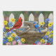 A spring gathering of colourful birds and flowers around a pretty water fountain birdbath.