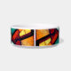 This is a heavy, durable bowl decorated with Tibbies of many colors, the perfect size for hungry/thirsty Tibs. The design is interesting and printing clear.
