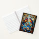 This exquisite notebook features an Art Deco-inspired stained glass design adorned with intricate depictions of two beautiful blue birds with bright red and yellow chests, perched on branches with lovely cream coloured blooms, with the blue sky behind. A captivating and artistic accessory for any creative or writing endeavour. Shown with college ruled paper.
