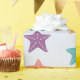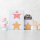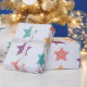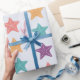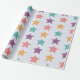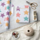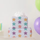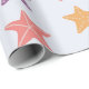A charming pattern of vibrant starfish in shades of purple, teal, coral, and yellow, neatly arranged on a soft white background. The playful arrangement and varied colours create a cheerful and lively marine-inspired design.