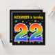 This fun, exciting, and vibrant birthday party invitation design features a colourful pattern of star shapes, along with the number "22" featuring a multicolored rainbow inspired spectrum or gradient pattern. The name on the front can be personalised. The back features customisable information about the party. Birthday party invitations like this might be sent to potential guests for a birthday party being held to celebrate somebody’s twenty second birthday. [~Z0000349]
