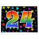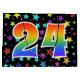 This exciting, fun, and vibrant gift bag design features a colourful stars pattern, along with the number "24" having a multicolored rainbow inspired spectrum gradient pattern, on a black coloured background. A gift bag like this could perhaps be a fun and happy way of wrapping gifts or presents being given for somebody’s twenty fourth birthday, or perhaps for a couple’s twenty fourth wedding anniversary, or some other 24th event. [~Z0000347]