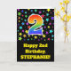 The front of this exciting, fun, and vibrant birthday greeting card design features a colourful star shapes pattern, along with the number "2" featuring a multicolored rainbow spectrum like gradient pattern, on a black coloured background. The front also features a birthday greeting message, including a personalised recipient name. The inside features a customisable birthday greeting message, or could perhaps be cleared and left blank if a message is to be written by hand instead. A personalised birthday card like this might be a fun way to acknowledge somebody’s second birthday. [~Z0000348]