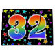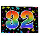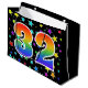 This exciting, fun, and vibrant gift bag design features many colourful star shapes, along with the number "32" featuring a multicolored rainbow inspired spectrum gradient pattern, on a black coloured background. A gift bag like this could perhaps be a fun and happy way of wrapping gifts or presents being given for somebody’s thirty second birthday, or perhaps for a couple’s thirty second wedding anniversary, or some other 32nd event. [~Z0000347]