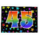 This exciting, fun, and vibrant gift bag design features a colourful stars pattern, along with the number "45" having a multicolored rainbow inspired spectrum gradient pattern, on a black coloured background. A gift bag like this might be a fun, happy way of wrapping gifts or presents being given for somebody’s forty fifth birthday, or perhaps for a couple’s forty fifth wedding anniversary, or some other 45th event. [~Z0000347]