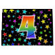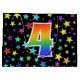 This exciting, fun, and vibrant gift bag design features a colourful pattern of star shapes, along with the number "4" featuring a multicolored rainbow spectrum like gradient pattern, on a black coloured background. A gift bag like this could perhaps be a fun and happy way of wrapping gifts or presents being given for somebody’s fourth birthday, or perhaps for a couple’s fourth wedding anniversary, or some other 4th event. [~Z0000347]