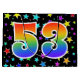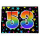 This exciting, fun, and vibrant gift bag design features a pattern of colourful star shapes, along with the number "53" having a multicolored rainbow inspired spectrum gradient pattern, on a black coloured background. A gift bag like this might be a fun, happy way of wrapping gifts or presents being given for somebody’s fifty third birthday, or perhaps for a couple’s fifty third wedding anniversary, or some other 53rd event. [~Z0000347]