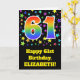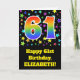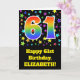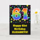 The front of this exciting, fun, and vibrant birthday greeting card design features many colourful star shapes, along with the number "61" featuring a multicolored rainbow inspired spectrum gradient pattern, on a black coloured background. The front also features a birthday greeting message, including a customised recipient name. The inside features a customised birthday greeting message, or could perhaps be cleared and left blank if a message is to be written by hand instead. A customisable birthday card like this might be a fun way to acknowledge somebody’s sixty first birthday. [~Z0000348]