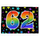 This exciting, fun, and vibrant gift bag design features a colourful star shapes pattern, along with the number "62" featuring a multicolored rainbow spectrum like gradient pattern, on a black coloured background. A gift bag like this might be a fun, happy way of wrapping gifts or presents being given for somebody’s sixty second birthday, or perhaps for a couple’s sixty second wedding anniversary, or some other 62nd event. [~Z0000347]