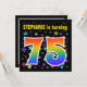 This exciting, fun, vibrant birthday party invitation design features a colourful pattern of star shapes, along with the number "75" featuring a multicolored rainbow like spectrum or gradient pattern. The name on the front can be customised. The back features personalised information about the party. Birthday party invitations like this might be sent to invite guests to a birthday party being held to celebrate somebody’s seventy fifth birthday. [~Z0000349]