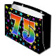 This exciting, fun, and vibrant gift bag design features many colourful star shapes, along with the number "75" featuring a multicolored rainbow inspired spectrum gradient pattern, on a black coloured background. A gift bag like this might be a fun way to wrap presents or gifts being given for somebody’s seventy fifth birthday, or perhaps for a couple’s seventy fifth wedding anniversary, or some other 75th event. [~Z0000347]