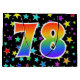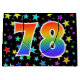 This exciting, fun, and vibrant gift bag design features numerous colourful star shapes, along with the number "78" featuring a multicolored rainbow inspired spectrum gradient pattern, on a black coloured background. A gift bag like this might be a fun, happy way of wrapping gifts or presents being given for somebody’s seventy eighth birthday, or perhaps for a couple’s seventy eighth wedding anniversary, or some other 78th event. [~Z0000347]