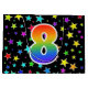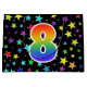 This exciting, fun, and vibrant gift bag design features numerous colourful star shapes, along with the number "8" featuring a multicolored rainbow inspired spectrum gradient pattern, on a black coloured background. A gift bag like this could perhaps be a fun and happy way of wrapping gifts or presents being given for somebody’s eighth birthday, or perhaps for a couple’s eighth wedding anniversary, or some other 8th event. [~Z0000347]