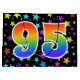 This exciting, fun, and vibrant gift bag design features many colourful star shapes, along with the number "95" featuring a multicolored rainbow inspired spectrum gradient pattern, on a black coloured background. A gift bag like this could perhaps be a fun and happy way of wrapping gifts or presents being given for somebody’s ninety fifth birthday, or perhaps for a couple’s ninety fifth wedding anniversary, or some other 95th event. [~Z0000347]