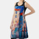 Walk through a street of vivid homes in a playful impressionist style, capturing city life in mixed abstract hues.
