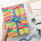 Layers of colourful brightly striped Christmas trees on a bright green background decorate this unique Christmas gift wrap. Make a vibrant splash with this bold geometric pattern wrapping paper. Modern. Bold. Bright and Merry. This fun Christmas gift wrap blends tradition with modern maximalism. A unique vibrant style for your Christmas and Holiday gifts with shades of pink, orange, green, red, yellow, and turquoise.
