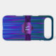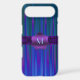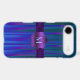 Stylish iPhone 6 case, with a foil looking blue, teal, purple and mauve abstract striped pattern. Graphics of a purple satin looking ribbon, runs across the middle of the case, is decorated with a purple wax looking seal, with a light blue one letter monogram. Personalise the letter for yourself or as a great gift idea.