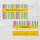 Colourful stripes pattern yellow band feminine business cards, featuring a striped pattern with colourful stripes in green, blue, yellow, red, white and your name on a yellow band. A fun, modern, contemporary, eye catching hip, abstract design with a touch of retro for personal or professional use.