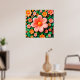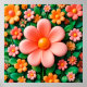 Colourful, stylised flowers set against a rich green background. Prominently in the centre is a large, soft pink flower with rounded petals and an orange centre. Surrounding it are smaller flowers in various shades of orange, pink, and yellow, creating a vibrant and cheerful composition