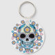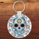 Sugar skull designed hues of blue and pink is surrounded by colourful flowers and hearts.