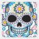 Sugar skull designed hues of blue and pink is surrounded by colourful flowers and hearts.