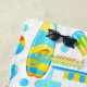 Colourful and joyful summer and beach objects pattern featuring illustration of ice-cream truck, beach ball, sand bucket, surf, ice-cream, water drops and a creative sun badge with a name monogram.